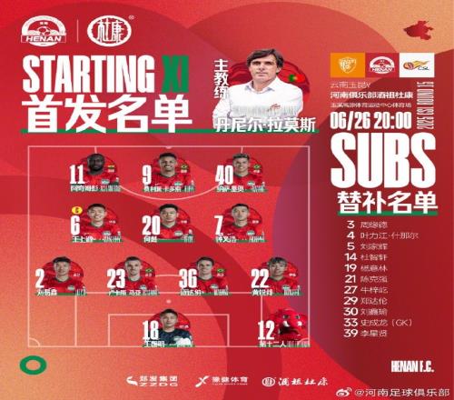 云南玉昆VS河南俱乐部酒祖杜康首发及替补队员名单